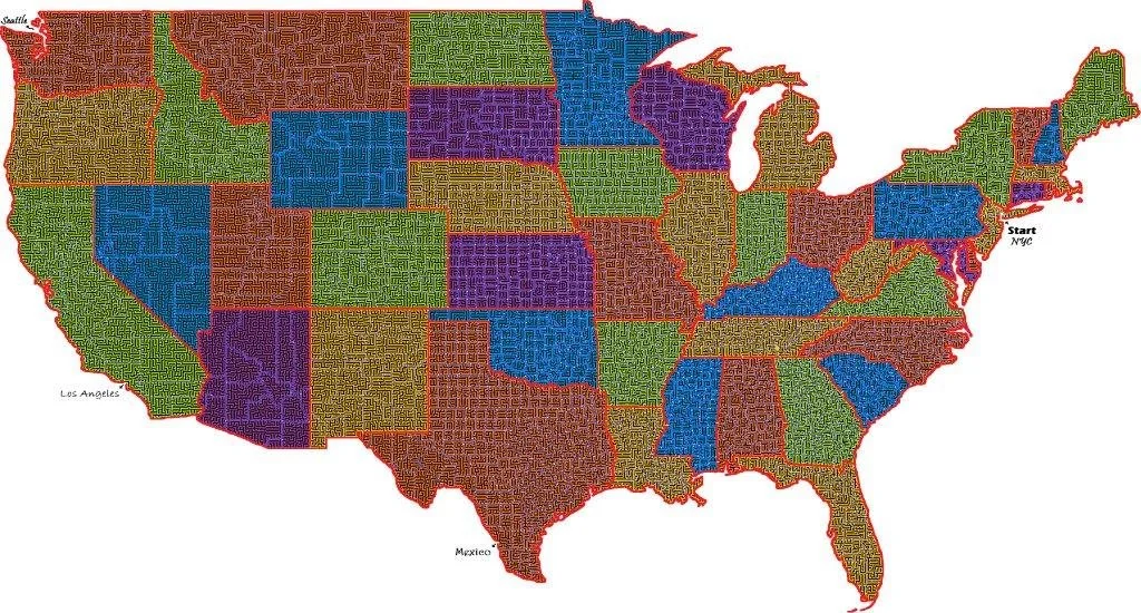 The above maze is one of my earliest mazes and is a VERY DIFFICULT maze of the 48 conterminous United States of America, also known as the Lower 48. You should also notice that each state is broken down further into its counties (or 64 parishes in the case of Louisiana), from the 254 Texas counties to the 3 in Delaware. This is actually 3 separate mazes, each starting in NYC and ending in Mexico, Los Angeles, or Seattle. If you take this challenge you will want to print it on large paper !! Good Luck !
